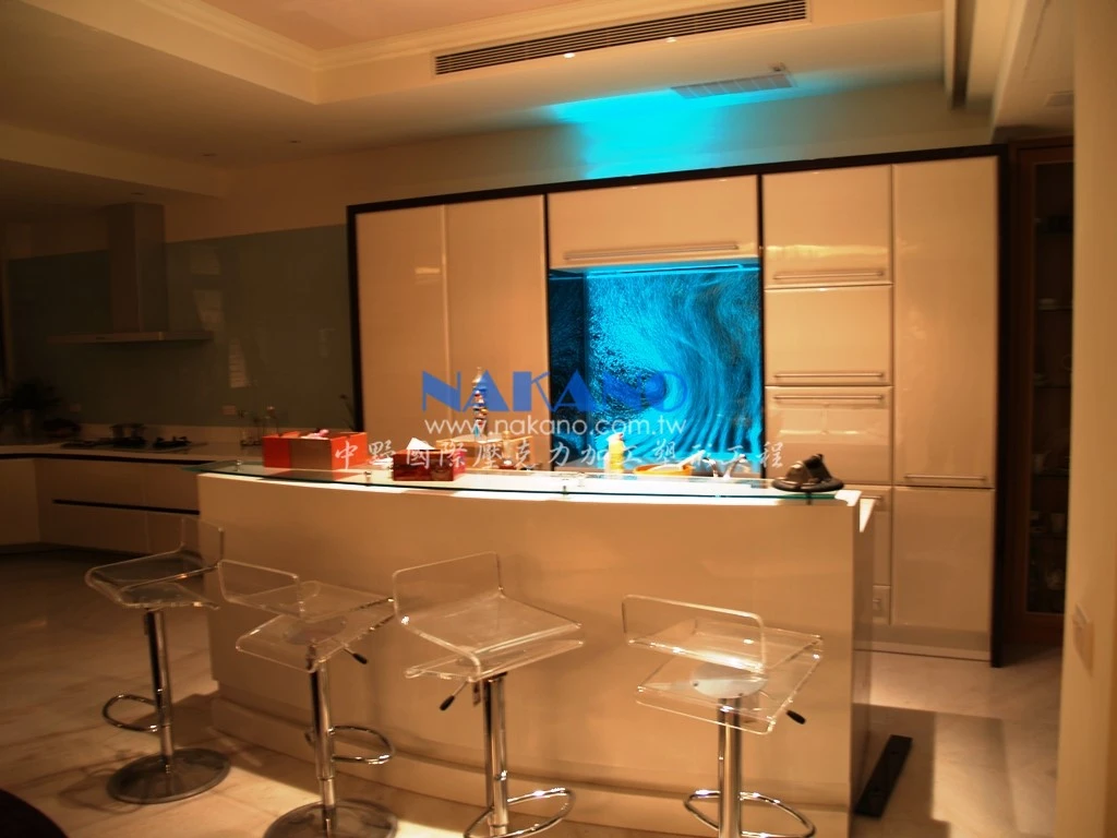 可搭配商業空間、住家或觀光景點等設計不同尺寸水舞牆,融合空間與藝術創造環境的生命力,中野水舞氣泡牆擺脫呆板靜態展現方式,可隨燈光變化及引導氣泡行進路徑展現氣泡在水中運動的活力,尤其氣泡在水中旋轉時產生鑽石般亮眼顆粒,特別引人注目。